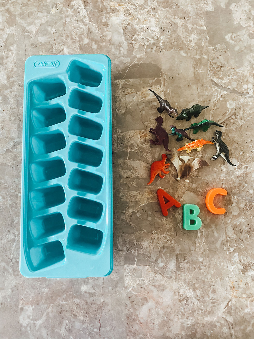 Small toys (I found our little dinosaurs at our local grocery store! Small plastic letters will work great as well. Really anything water proof that will fit in the tray! If you're learning about letters, colors, shapes, this is an activity you can customize.