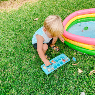 Make sure the toys are slightly sticking out of ice to help your child remove the ice cube from the tray. Let them explore the ice cubes and encourage vocabulary like, cold, melt, touch. Encourage child to independently remove the ice cubes, and either put them in the water to melt or on a surface. Demonstrate manipulating the dinosaur to help remove the ice. Then let them free to explore and examine a new concept!